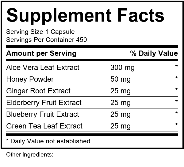 This formula combines Aloe Vera leaf extract with a selection of botanical ingredients including honey powder, ginger root extract, elderberry, blueberry, and green tea leaf extract.