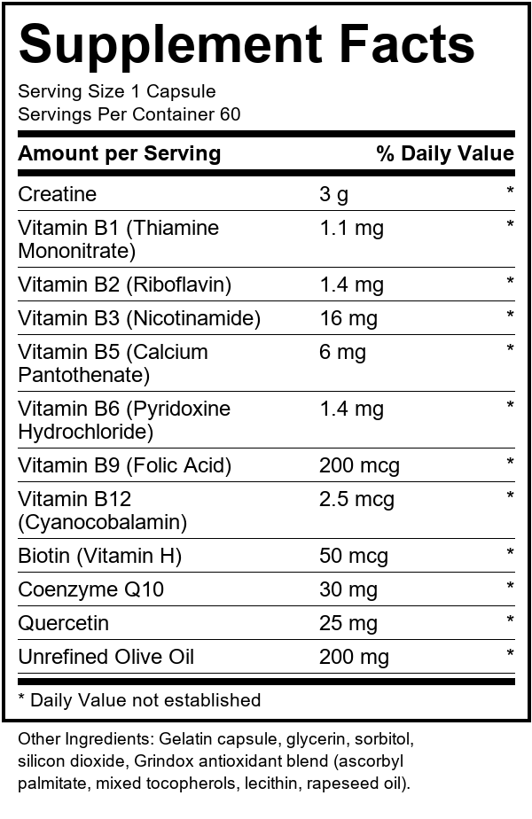 Creatine Complex is a formulation built around creatine and an extended range of complementary nutrients. The recipe combines a creatine base with a spectrum of B-vitamins, Coenzyme Q10, quercetin, and unrefined olive oil, creating a multifaceted nutrient mix often used in complex sport-nutrition products.