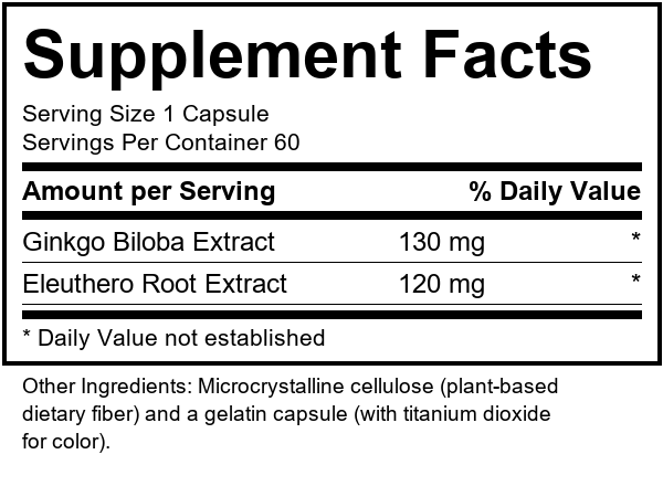 This product features Ginkgo Biloba leaf extract and Eleuthero root extract, two plant-derived ingredients commonly used in dietary supplement blends.